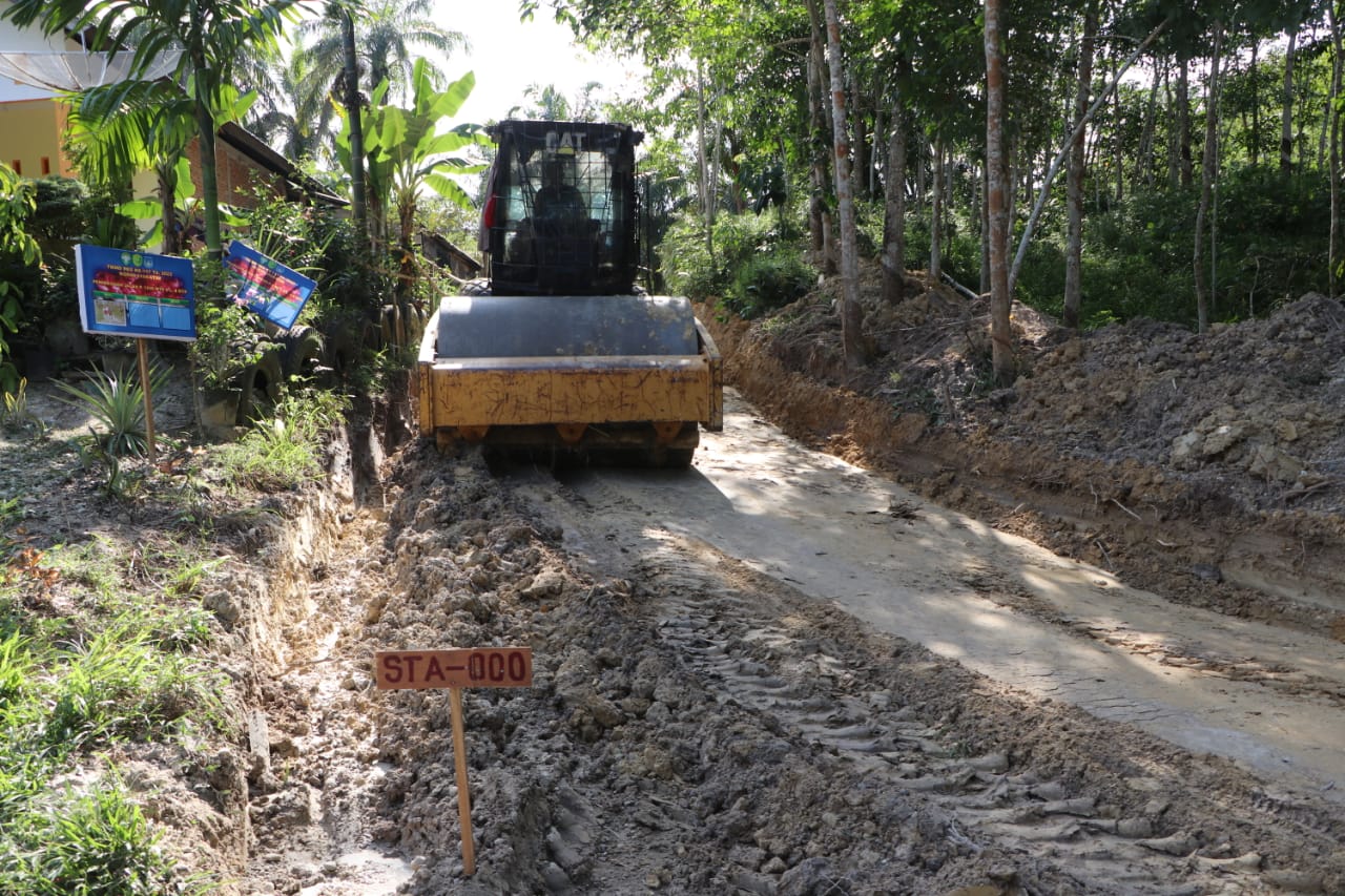 Jalan yang sebelumnya selesai ditimbun dengan material tanah dan batu kerikil kini berlanjut ke tahap pengerasan dengan melibatkan alat berat guna memaksimalkan kepadatan tanah di badan jalan.