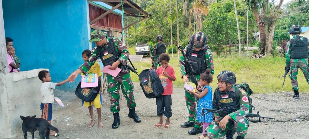 Kabupaten Kerom, indomaritim.com – Satuan Tugas Pengaman perbatasan RI-PNG Sektor Utara, Yonif 122/TS, yang berada di bawah Kolakopsrem 172/PWY Pos Kalibom membagikan perlengkapan sekolah kepada anak-anak Kampung kalibom, Distrik Waris, Kabupaten Kerom, Papua, (24/10/2023).