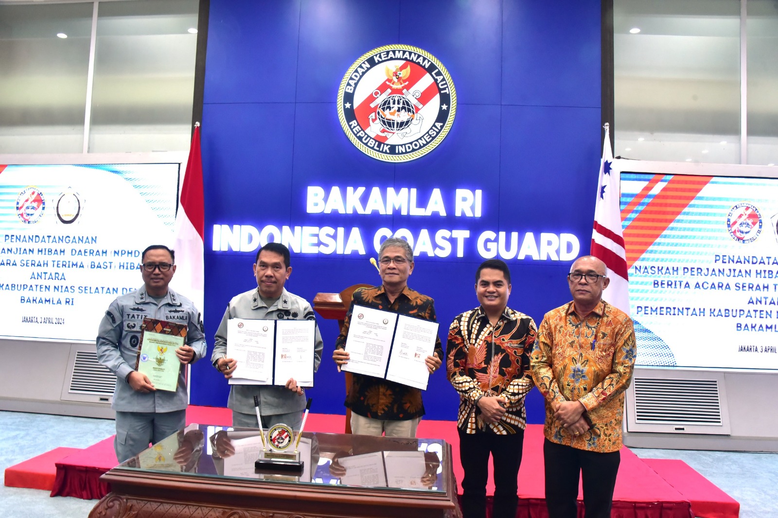 Jakarta, indomaritim.com – Bakamla RI menerima hibah tanah dengan luas 13.560 m2 dan dua bangunan seluas 400 m2 dan 168 m2 dari Pemerintah Kabupaten Nias Selatan. Hibah tersebut secara resmi diterima oleh Bakamla RI melalui Penandatangan Naskah Perjanjian Hibah Daerah (NPHD) dan Berita Acara Serah Terima, di Aula Ary Hasibuan Mabes Bakamla RI, Jakarta Pusat, Rabu (3/4/2024).