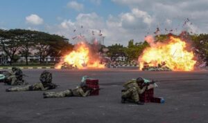 Tim Penanggulangan Kebakaran (PEK) KRI LPU-861 masih terus melaksanakan pengawasan serta bersinergi unsur kapal lainnya dalam penanggulangan kebakaran MV. Layar Anggun 8 menggunakan sekoci dengan peralatan pemadaman sistem pompa air laut Alkon.