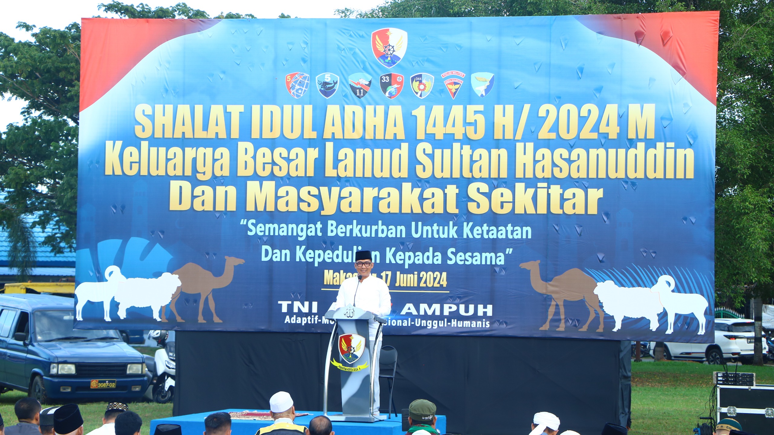 Dalam sambutannya Danlanud Sultan Hasanuddin Marsma TNI Bonang Bayuaji G, S.E., M.M., CHRMP., menyampaikan bahwa iduladha merupakan salah satu momentum dari sekian banyak hari besar Islam, yang memiliki dampak syiar bersifat ritual maupun sosial bagi pembangunan keagamaan di tengah-tengah masyarakat. “Idul Adha juga merupakan wujud rasa syukur kita, atas berbagai kenikmatan yang telah kita peroleh, serta ketaatan kepada perintah Allah SWT, agar kita selalu dapat mendekatkan diri kepada-Nya”, ucapnya.