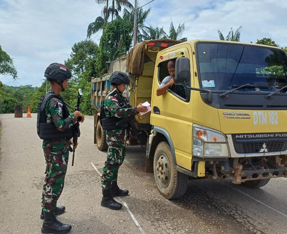 Anggota TNI dari Satgas Pamtas Statis RI-PNG Pos Simpang PNG dipimpin Danpos Serka Muhamad Nasir Harahap, Melakukan pemeriksaan sejumlah kendaraan yang masuk wilayah Perbatasan Papua Selatan,