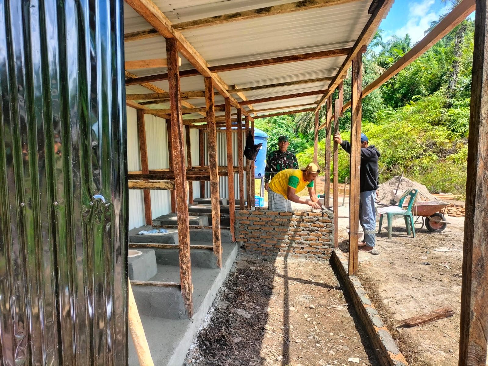 Pembangunan MCK dilaksanakan secara gotong royong oleh personel TNI di lapangan. Seluruh tahapan pekerjaan telah diselesaikan hingga mencapai 100 persen, meliputi pembuatan septic tank, pemasangan atap dan dinding, instalasi pipa air dan kran, pemasangan kloset, pengerjaan lantai, serta penyiapan tandon air.