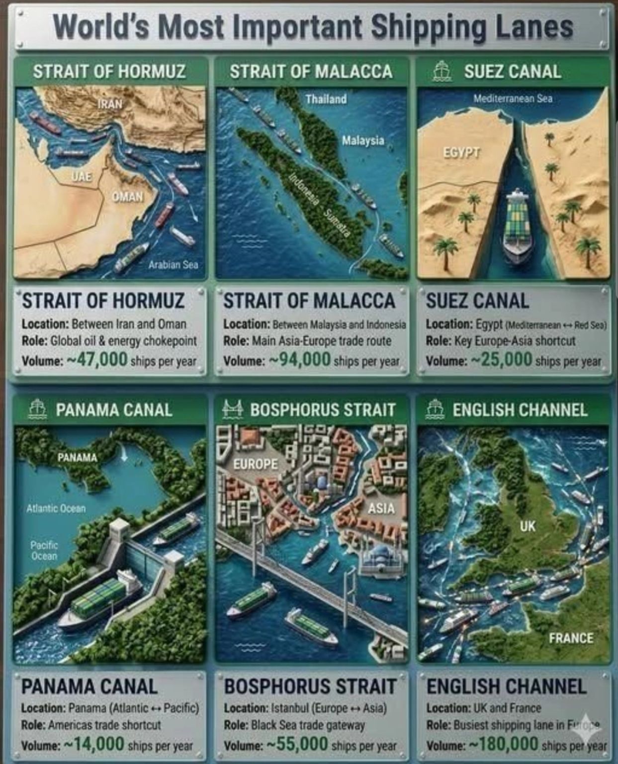 Di balik kelancaran perdagangan global yang kita nikmati setiap hari—mulai dari harga BBM yang relatif stabil hingga ketersediaan barang elektronik di mal-mal—tersembunyi sebuah kerapuhan struktural yang jarang dibahas di ruang publik. Dunia hanya bergantung pada beberapa “leher botol” laut berupa selat sempit dan terusan buatan. Data terbaru tentang lalu lintas maritim global menunjukkan bahwa hanya lima selat dan dua terusan yang menanggung beban luar biasa dari pergerakan minyak, gas, dan barang manufaktur. Selat Hormuz misalnya, yang terletak di antara Iran dan Oman, hanya selebar kurang dari 50 kilometer pada titik tersempitnya, tetapi harus dilalui oleh sekitar 47.000 kapal setiap tahunnya. Bandingkan dengan Selat Malaka antara Malaysia dan Indonesia yang jauh lebih ramai, dengan 94.000 kapal per tahun, atau Selat Inggris yang paling padat di dunia dengan 180.000 kapal per tahun. Angka-angka ini bukan sekadar statistik pelayaran—mereka adalah peta denyut nadi ekonomi global yang sangat rentan terhadap satu tembakan, satu penyanderaan, atau satu keputusan politik yang salah.
